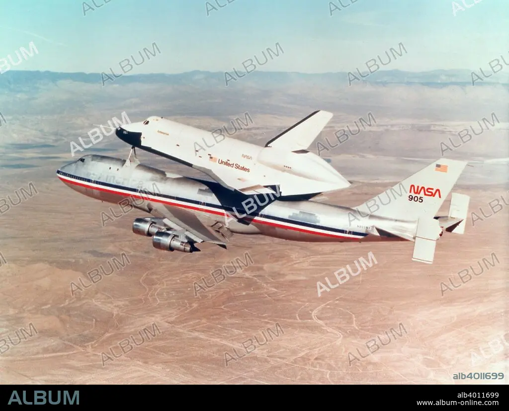 Space Shuttle Orbiter mounted on top of a Boeing 747 carrier aircraft, 1977. The Shuttle Orbiter is often transported this way from landing site to launch site. Here it is being flown prior to early landing tests of the Orbiter, during which it was released from the 747 aircraft and glided into land as it would on return from space. The first landing test took place on 12 August 1977.