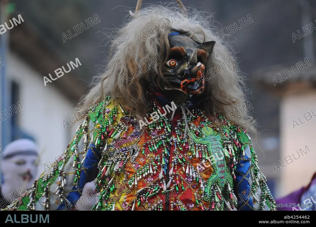 Characters in costumes wearing masks at the annual festival in honor of their patron saint, Mamacha Carmen at Pucartambo, Cusco, Peru. The Virgin Mary is carried in procession through the streets, preceded and followed by traditional dancers of several types, and many festival goers. Traditional dances of the festival include Chukchu, Ch'unchu, Qhapaq negro, Qhapaq Qulla and Saqra.