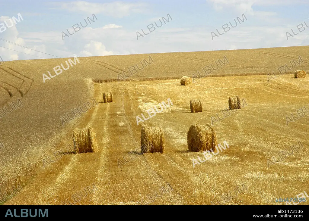 BALAS DE PAJA en un CAMPO DE CULTIVO en época de siega. Francia.