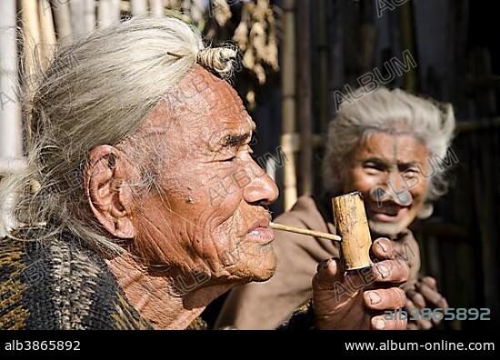 Old Apatani man with the typical hair knot at the forehead, next to a woman with the traditional noseplugs, in front of their house, Hong village, Arunachal Pradesh, India, Asia