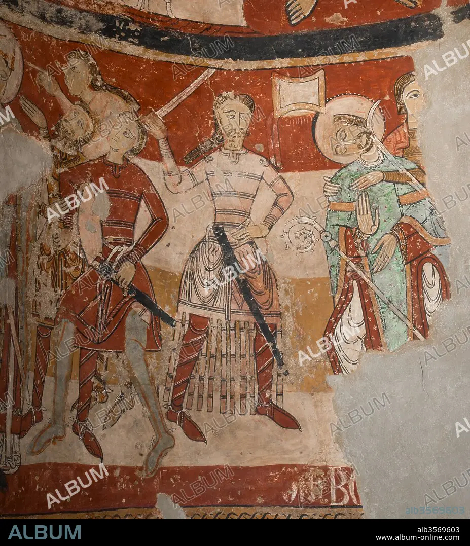 Descripción: Detalle de la pintura mural en la parte inferior del abside de la iglesia de Santa María de Terrassa, representando el martirio de santo Tomás Becket, Siglo X, Terrassa, Barcelona, Cataluña, España