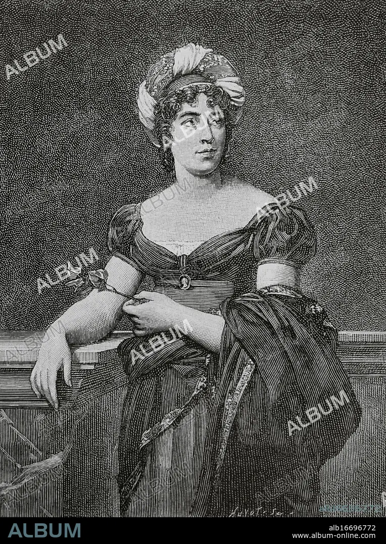 Anne-Louise Germaine Necker (1766-1817), conocida como Madame de Staël. Filósofa, escritora y teórica política franco-suiza. Famosa por su salón literario en París. Retrato. Grabado de Huyot a partir de la pintura realizada por François Gérard (1770-1837), 1817-1818. "Directoire, Consulat et Empire. Moeurs et usages, lettres, sciences et arts. France, 1795-1815" (Directorio. Consulado e Imperio. Costumbres y tradiciones, letras, ciencias y artes. Francia, 1795-1815), por Paul Lacroix. Publicado en París, 1884.