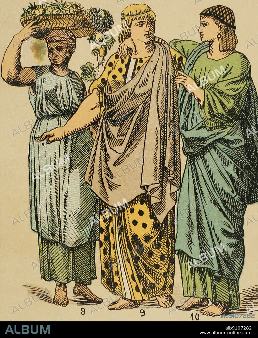 Península Anatólica. Lidios, frigios y troyanos. Trajes de mujer. De izquierda a derecha; 8: mujer del pueblo, 9-10: mantón cuadrado. Cromolitografía. Historia Universal, por César Cantú. Tomo I, 1881.