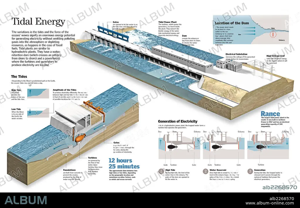 Infografía ?de la estructura y funcionamiento de una planta de generación de energía mareomotriz.