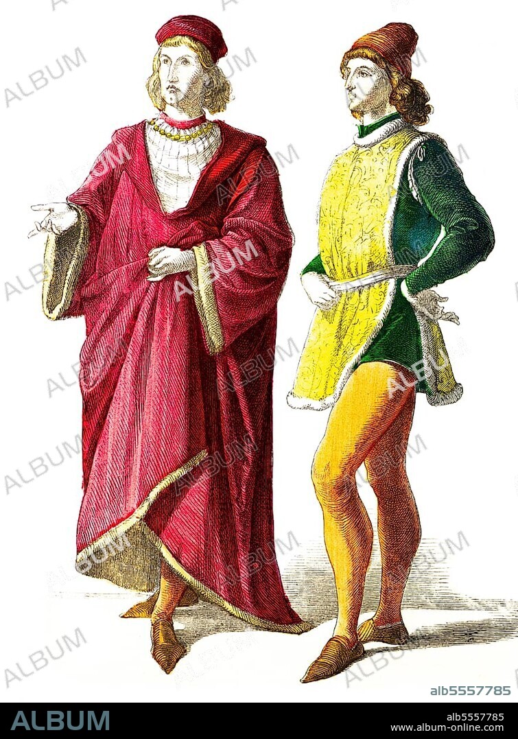 Münchener Bilderbogen, Costumes, First half of 15th century, Two Florentine noblemen, Florence, men, fashion, robes, elegant, portrait, historical illustration 1890.