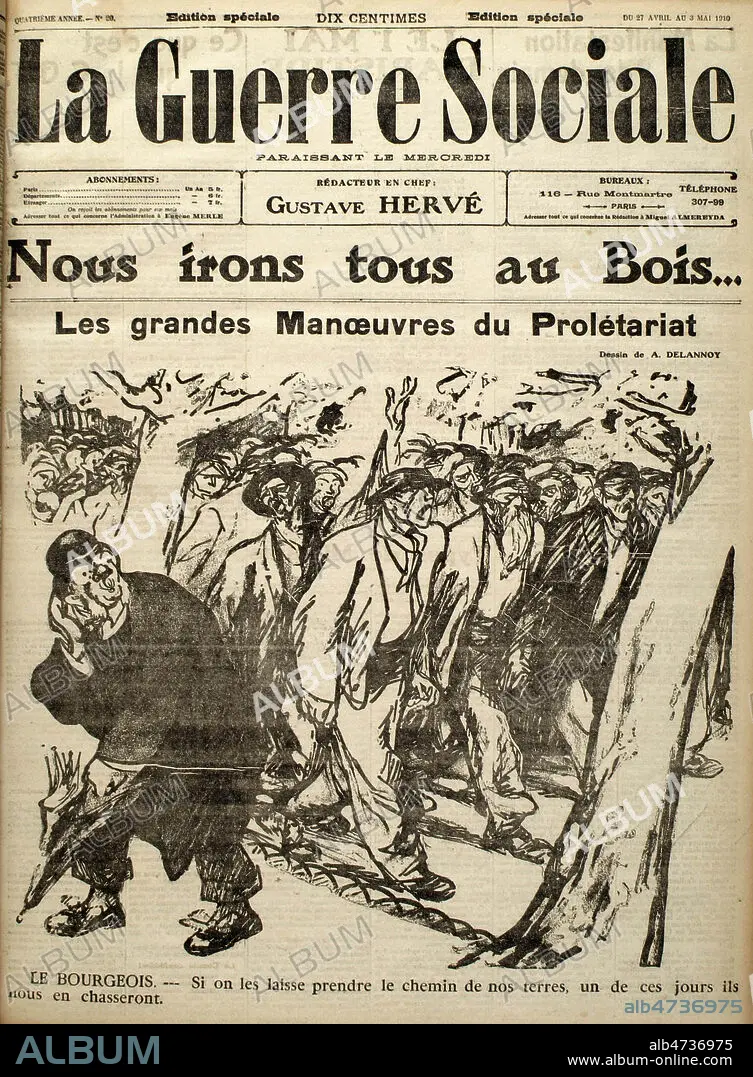 'Nous irons tous au bois... Les grandes manoeuvres du proletariat. Le bourgeois : si on les laisse prendre le chemin de nos terres, un de ces jours ils nous en chasseront. Couverture de 'La guerre sociale' du 27 avril 1910, illustration par DELANNOY (1874-1911). Credit : Coll. Dixmier/KHARBINE-TAPABOR.