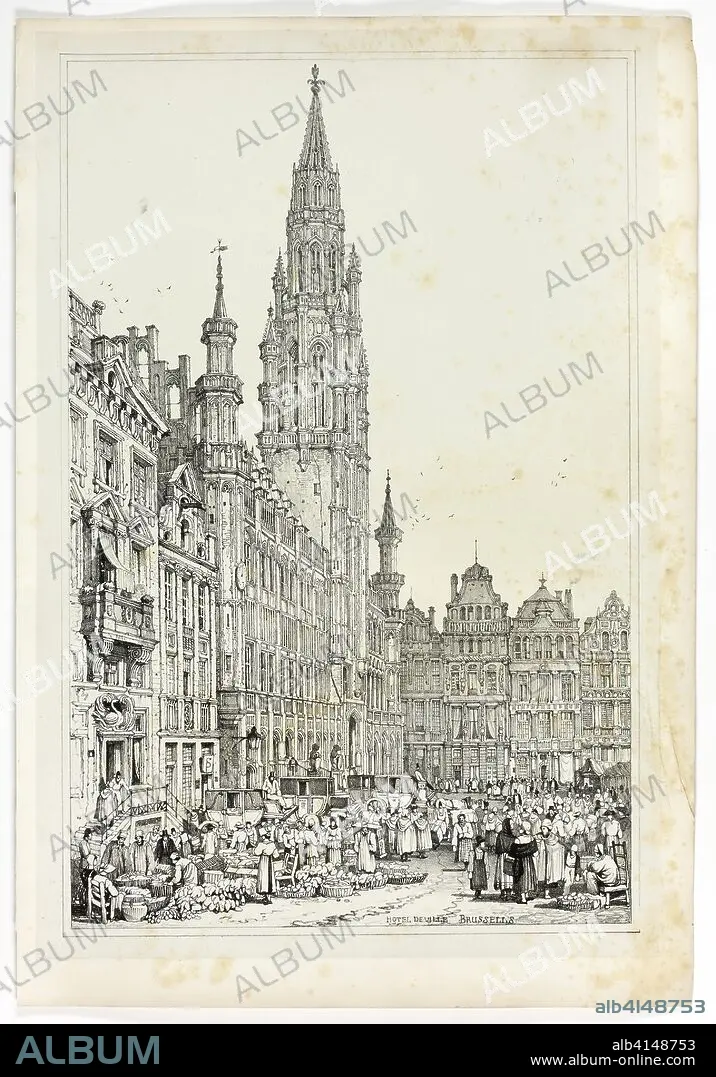 Hotel de Ville, Brussells. Samuel Prout (English, 1783-1852); probably printed by Charles Joseph Hullmandel (English, 1789-1850); probably published by Rudolph Ackermann (English, 1764-1834). Date: 1833. Dimensions: 290 × 425 mm (image); 310 × 445 mm (primary support); 345 × 500 mm (secondary support). Lithograph in black on grayish-ivory chine, laid down on ivory wove paper. Origin: England.