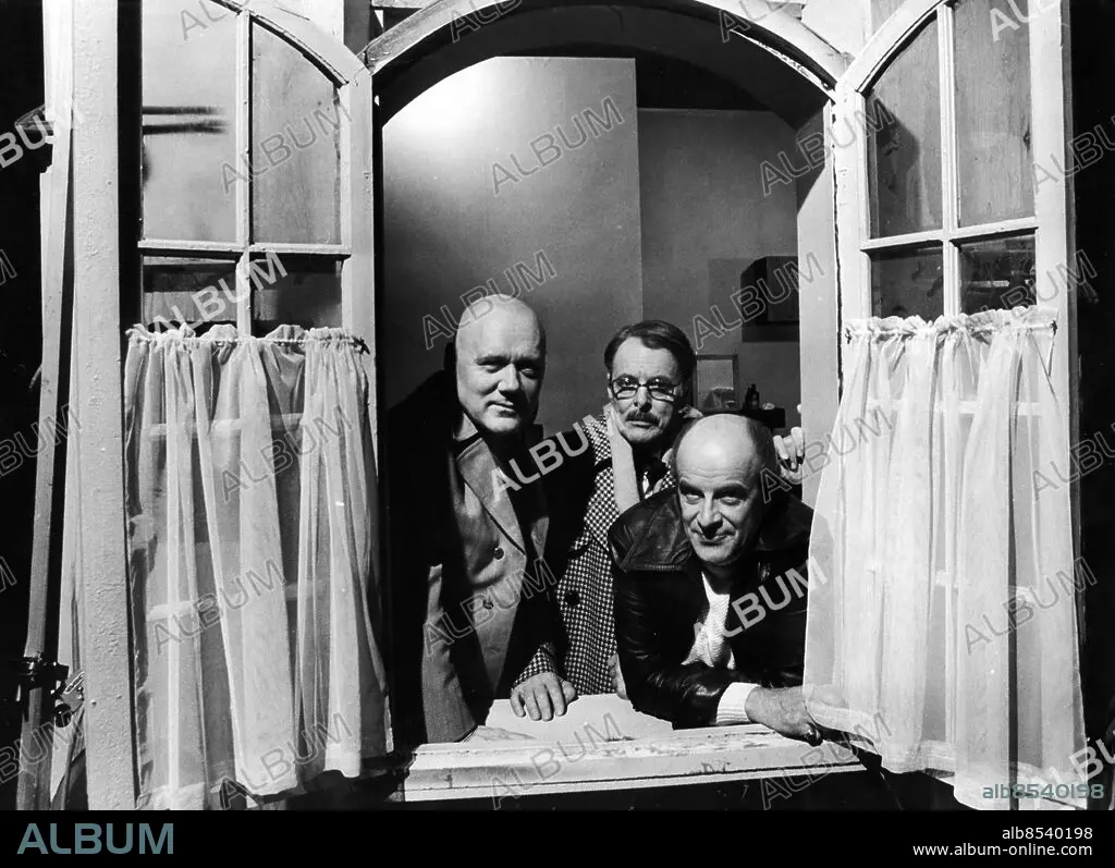 GÖTEBORG 1977-01.. Ur fönstret till skådespelarens loge tittar huvudpersonerna i en ny tv-serie skriven av Erland Josephson. Det är från vänster Olof Thunberg, Sven Lindberg och Ingvar Kjellsson. *** Local Caption *** GP Foto: Walter Hedén / Kamerareportage / TT / Kod: 2524
