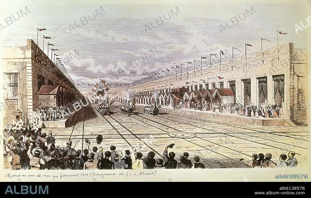 MADRID SE UNE AL MAR POR FERROCARRIL - INAUGURACION DEL FERROCARRIL MADRID-ALICANTE - 1858 - LITOGRAFIA SIGLO XIX