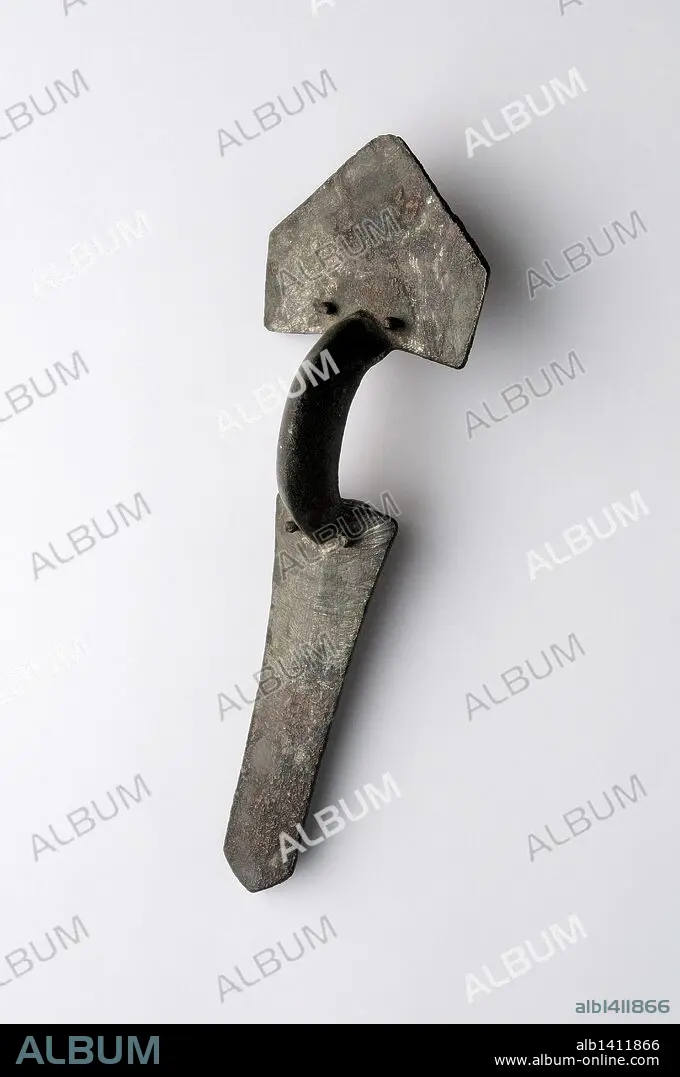 Descripción: Fíbula trilaminar de arco en bronce, formada por tres piezas martilladas y unidas por clavos .Dimensiones 10, 2 x 3, 1 cm Altura 2 cm (Siglo V dc ) - Epoca Visigoda , procedente de la " Necrópolis de Afligidos " - Yacimiento arqueológico de Complutum en Alcalá de Henares ( Madrid ). ESPAÑA .