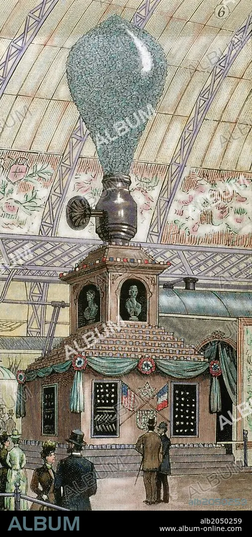 Lámpara incandescente gigante, doce pies de altura, montada en un pedestal coronado por un modelo de la bombilla de Edison, aumentada 20.000 veces. Se mostró como uno de los inventos de Thomas Edison (1847-1931) en la Exposición Universal de París en 1889. Grabado publicado en "La Ilustración Española y Americana" en 1889. Coloreado.