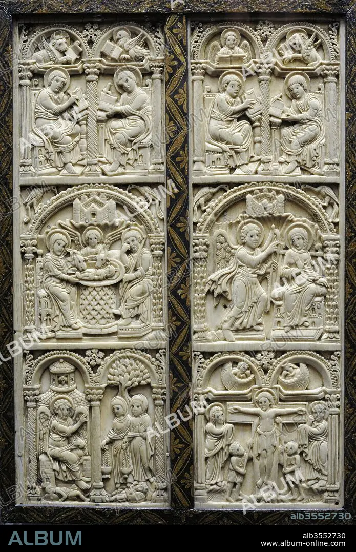 Descripción: Arte Medieval. El llamado Díptico de Harrach. Escuela de la corte de Carlomagno, hacia el 800. Reverso. España o norte de Italia, hacia el 700-750. Marfil. Museo Schnutgen. Colonia, Alemania.