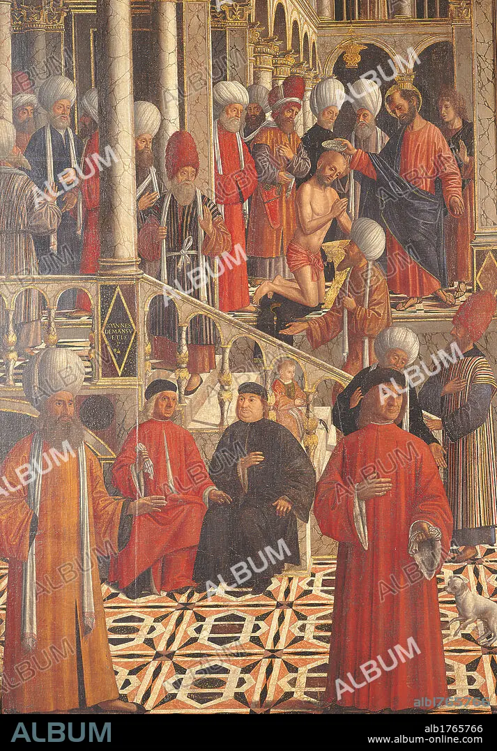 Traducción automática: Italia, Lombardía, Milán, Galería de Arte de Brera. Detalle. San Marcos Aniano bautismo espectadores turbantes vestido oriental perspectiva arcos columnas balcones pavimento escalera rojo naranja blanco azul pálido negro beige. Se requiere autorización para uso no editorial