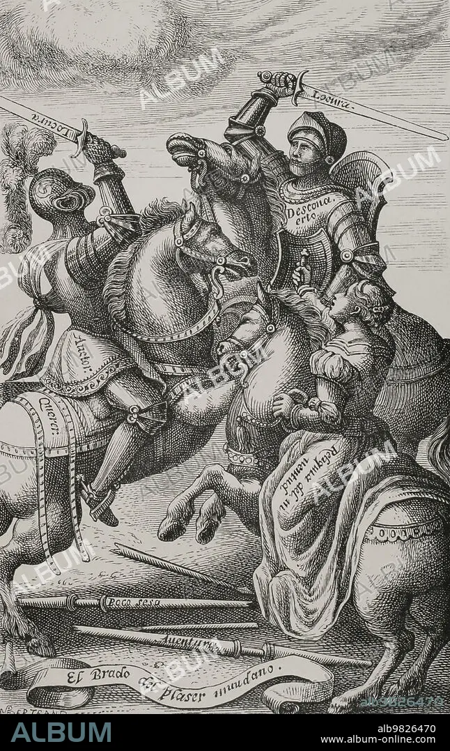 La caballería representada por personajes alegóricos. Facsímil por Huyot de un grabado de de "Le Chevalier délibéré", en su versión española, traducida por Hernando de Acuña y publicada en 1553; obra original del borgoñón Oliver de la Marche publicada en 1488. "Vie Militaire et Religieuse au Moyen Age et à l'Epoque de la Renaissance". París, 1877.