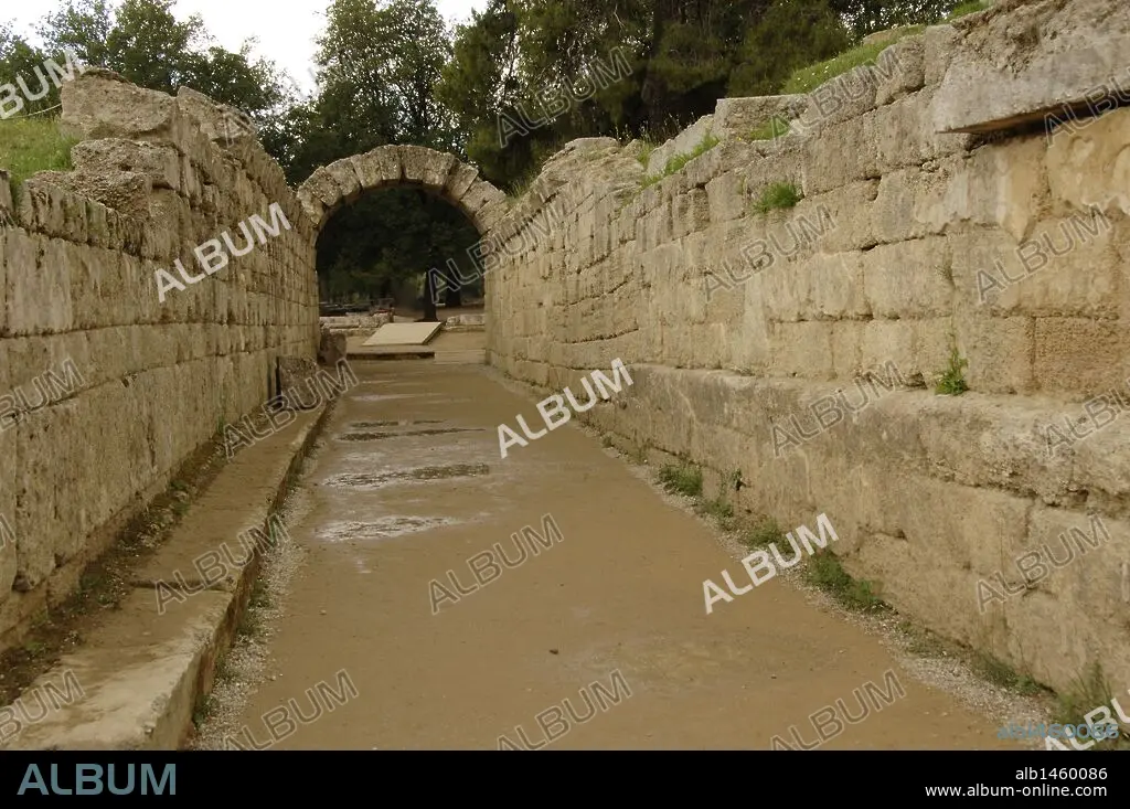 Descripción: ARTE GRIEGO-HELENISTICO. GRECIA. ESTADIO DE OLIMPIA. Vista de la ENTRADA a través de un PASADIZO ABOVEDADO de época helenística (s. III a. C.) que se conserva en parte. OLIMPIA. Provincia de Ilía. Región Peloponeso.