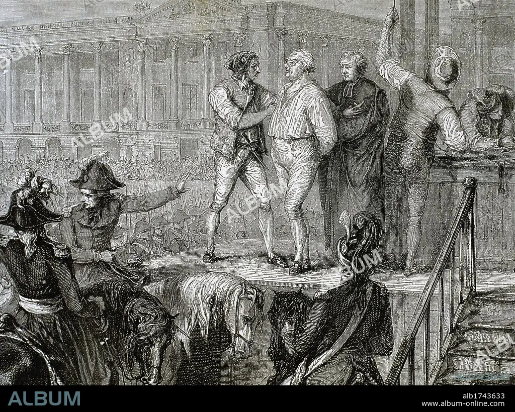 Descripción: REVOLUCION FRANCESA. Ejecución del rey LUIS XVI (1754-1793), el 21 de enero de 1793, tras un largo proceso que duró desde el mes de noviembre de 1792 a enero de 1793 Su intento de fuga, la protección que daba a los emigrados y sus negociaciones con el extranjero fueron causa de su detención en el Temple. Grabado.