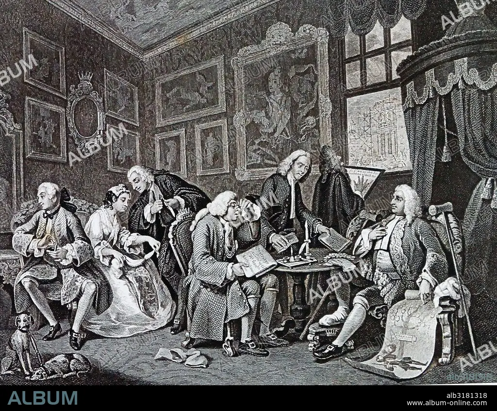 The Marriage Settlement from Marriage à-la-mode, 1743 - 1745; by William Hogarth. depicts an arranged marriage between the son of bankrupt Earl Squanderfield and the daughter of a wealthy, miserly city merchant. By William Hogarth (1697 – 1764). English painter, printmaker, satirist.