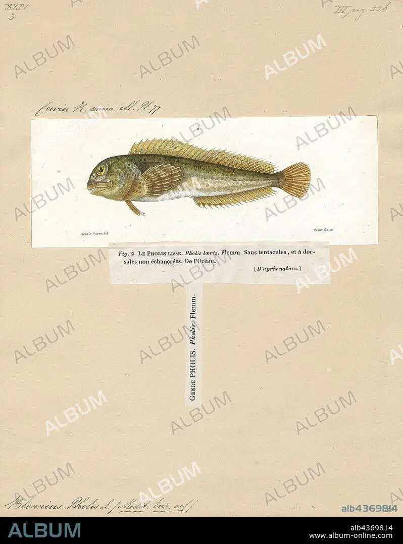 Blennius pholis, Print, Lipophrys pholis, commonly known as shanny, also known as the smooth blenny or common blenny, is a species of combtooth blenny. It matures at two years of age. Distributed in the Eastern Atlantic from the southern Norway to Morocco and Madeira, including the Mediterranean and the Balearics. Lipophrys pholis feed primarily on crustaceans, but also feed on other invertebrates and plants., 1700-1880