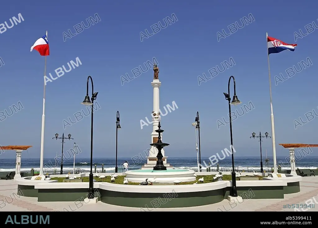 The Chilean and the Croatian flag, memorial, Croatian, Slavic square, waterside promenade, Croatia, Iquique, Norte Grande, northern Chile, Chile, South America, Europe