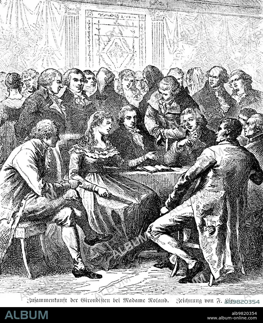 Madame Roland; meeting of the Girondists; France; revolution; politics; 18th century; history; room; conversation; assembly; guillotine; beheading; historical illustration 1894; Europe