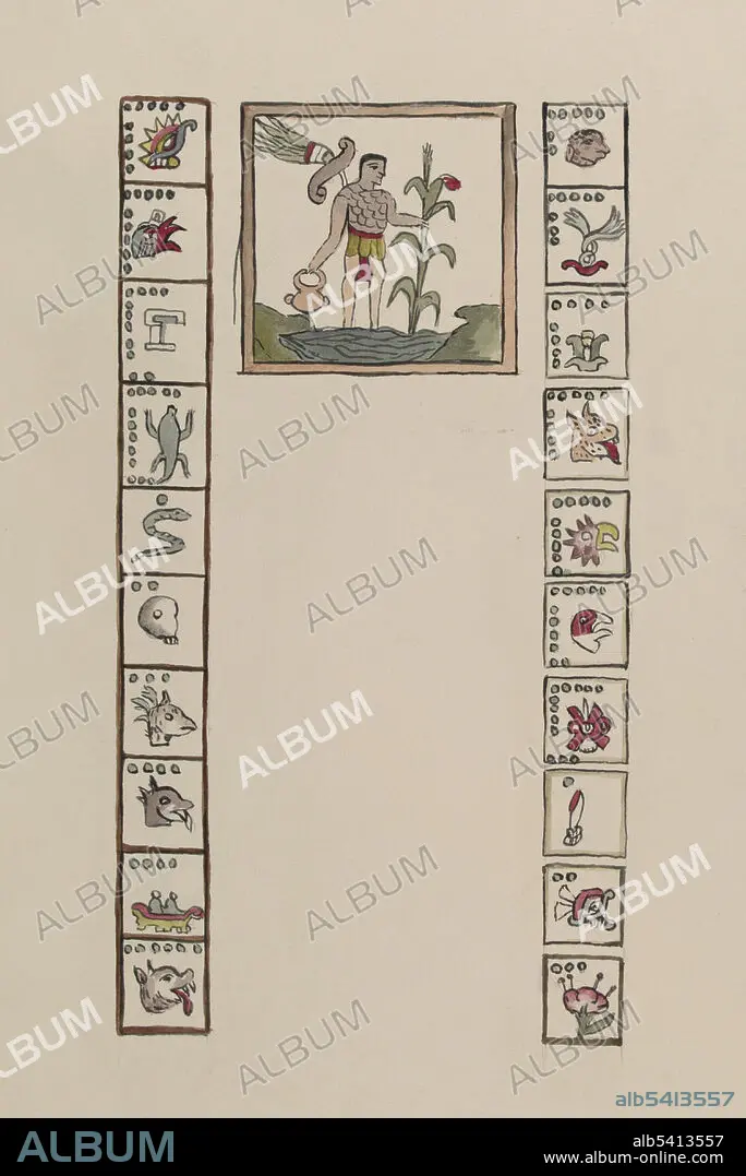 An Aztec month, showing the name of each day of the month. At the top is an image of a man with fish-scale torso and quetzal plume, standing in water and holding a stalk of maize and a vessel. The Aztecs used two calendars to compute the days of the year. Xiuhpohualli (the first, or solar, calendar) consisted of 365 days, divided into 18 months of 20 units each, plus an additional period of five empty days at the end of the year. Tonalpohualli (day count calendar) was made up of 260 days, combinations of 13 numbers and 20 symbols. Every 52 years both calendars would align. The image probably indicates that the month shown here is the sixth month, Etzalcualiztli (Meal of Maize and Beans). The Tovar Codex (16th century) contains detailed information about the rites and ceremonies of the Aztecs. The codex is illustrated with 51 full-page paintings in watercolor. Illustration taken from a 19th century transcript of Juan de Tovar's Historia de la benida de los yndios apoblar a Mexico (the Co´dice Tovar). Rare Book and Special Collections Division Jay I. Kislak Collection.