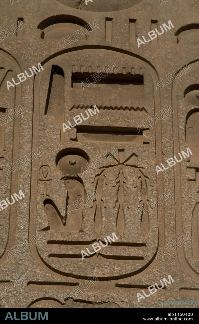ESCRITURA JEROGLIFICA. EGIPTO. PROTOCOLO REAL DE RAMSES II. Detalle de uno de los CARTUCHOS donde se escribía el conjunto de nombres o títulos que asumía el faraón en el momento de su ascensión al trono. OBELISCO DE RAMSES II. TEMPLO DE LUXOR. DINASTIA XIX. (1320-1200 a. C.). IMPERIO NUEVO.