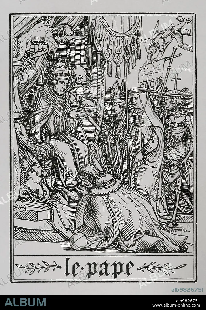 El Papa visitado por la Muerte. Facsímil de un grabado perteneciente a la serie de "La Danza de la Muerte" de Hans Holbein el Joven, en "Les Simulachres et Histoires facées de la Mort", 1538. "Vie Militaire et Religieuse au Moyen Age et à l'Epoque de la Renaissance". París, 1877.