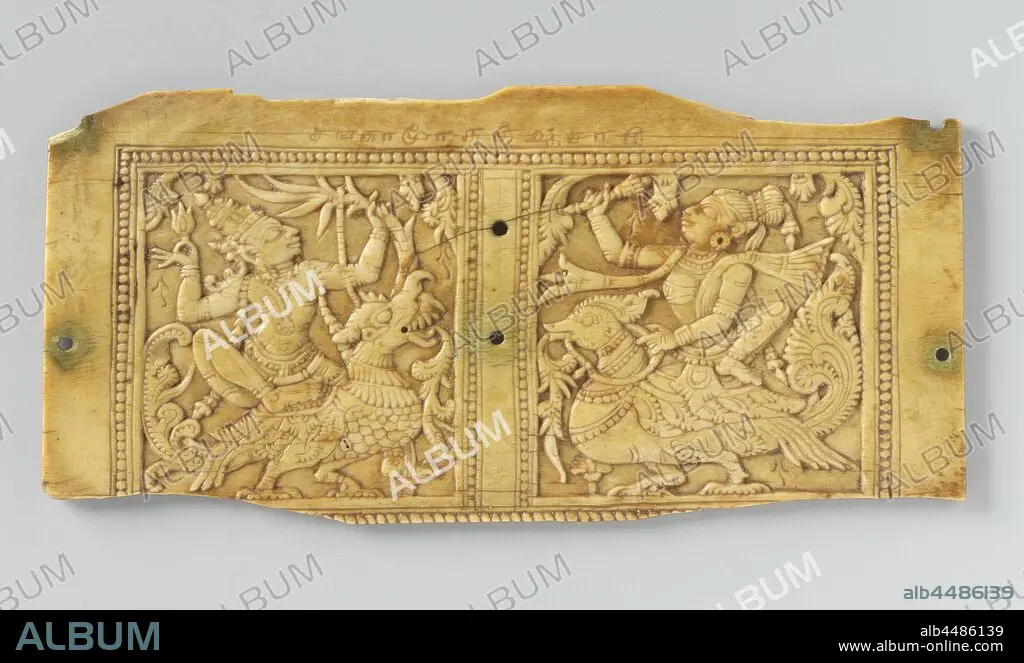 Panel with Kama and Rati, Rectangular panel with a representation in low relief. In two square fields the deities Kama (left, god of love) and Rati (goddess of sexual pleasure), on their riding animals, a parrot and a goose respectively. The performances are surrounded by a simple pearl rim. Above the fields an inscription in Tamil: 'the master craftsman Shankaramurtti'., anonymous, Zuid-India, c. 1700 - c. 1800, ivory, cutting, h 5 cm × w 12 cm