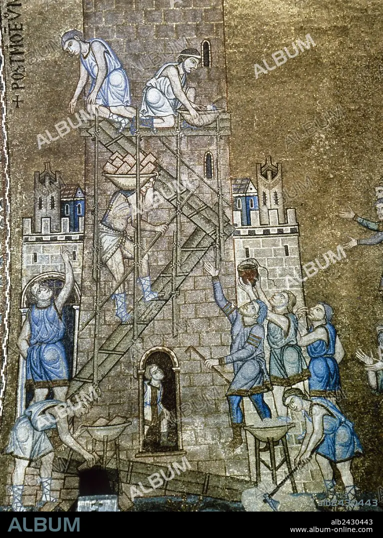 Descripción: ARTE BIZANTINO. ITALIA. "LA CONSTRUCCION DE LA TORRE DE BABEL". Mosaico del atrio de la Basílica de San Marcos, datado entre los siglos XII-XIV de patente tradición bizantina. Venecia.