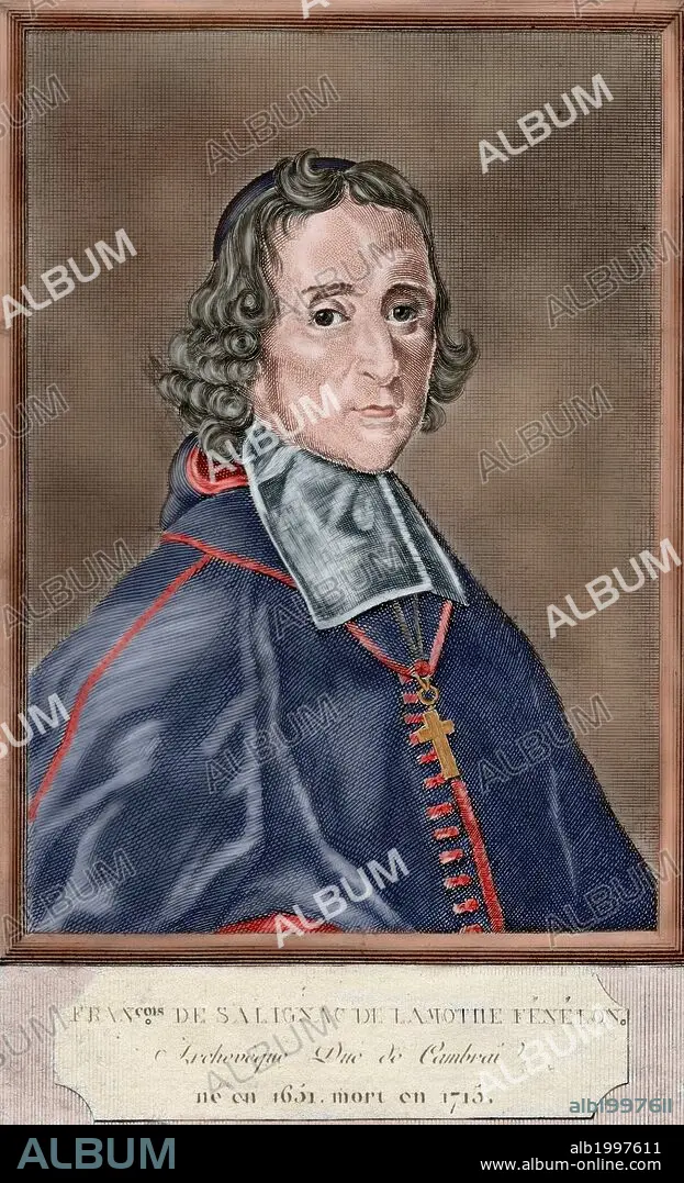 FRANÇOIS FENELON (François de Salignac de la Mothe Fénelon) (1651-1715). Filósofo, teólogo, escritor y pedagogo francés. En el año 1693 fue elegido miembro de la Academia Francesa. Grabado del año 1699. Coloreado.
