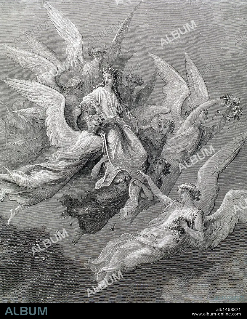 Descripción: "LA DIVINA COMEDIA". Poema escrito en toscano donde se relata el viaje de su autor, DANTE ALIGHIERI, para llegar a la CONTEMPLACION DIVINA. "EN MEDIO DE UNA NUBE DE FLORES QUE ESPARCIAN AL AIRE MANOS ANGELICALES" (Purgatorio, c. XXX). Grabado de DORE.