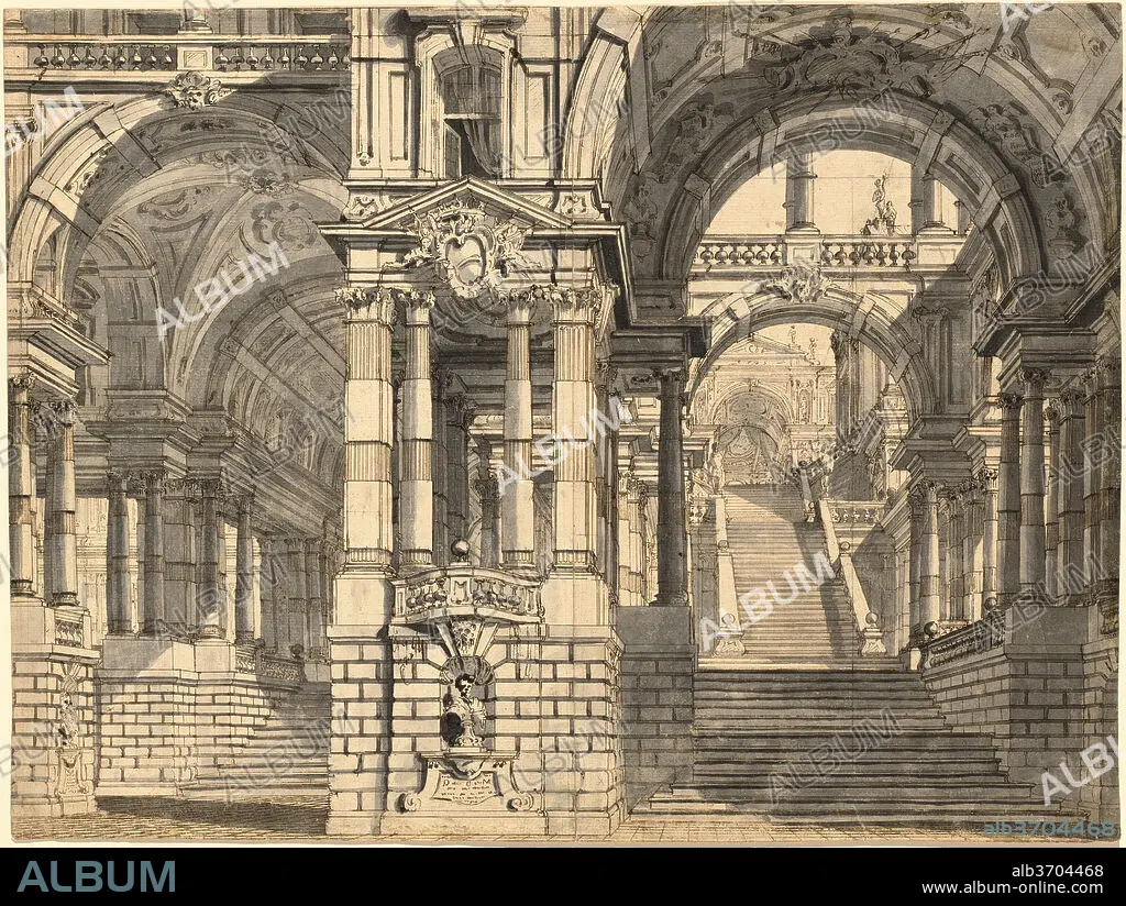 Fantasy of Magnificent Courtyards and Loggie with a Monumental Staircase. Dated: early 1770s. Dimensions: overall: 38.3 × 51.1 cm (15 1/16 × 20 1/8 in.). Medium: pen and brown ink with gray and black wash over graphite on two joined pieces of laid paper.