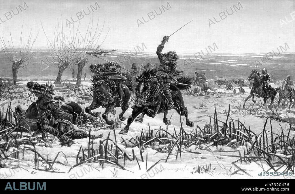 Prince Rupert at the Battle of Edgehill, 1642 (1887). Prince Rupert of the Rhine, nephew of King Charles I, leading the Royalist cavalry in a charge at Edgehill, the indecisive first major battle of the English Civil War. After the picture by Stanley Berkley. A print from The Illustrated London News, 12th February 1887.