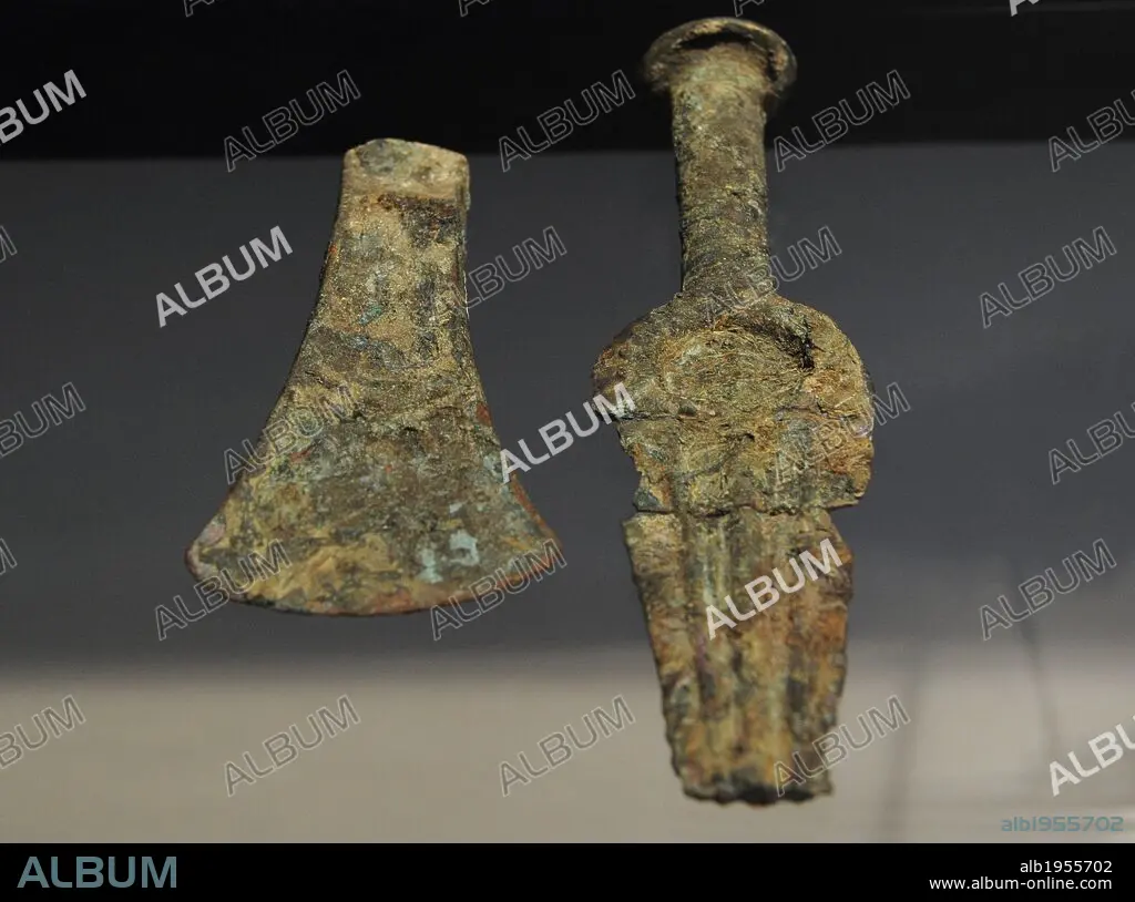 Descripción: ARTE. PREHISTORIA. EDAD METALES. EUROPA. Daga de bronce importada de Europa Central, y Hojsa hoja de hacha de bronce, de fabricación local. Piezas procedentes de Vigerslev, ceca a Copenhague. 2000-1700. C. Museo Nacional. Copenhague. Dinamarca. Europa.