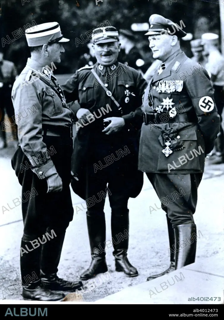Hermann Göring, German Nazi politician and military leader, c1930s-c1940s. A decorated World War I fighter ace who flew with Baron Manfred von Richthofen's squadron, Göring (1893-1946) (right) joined the Nazi party in 1922. The following year he was involved in the Munich Beer Hall Putsch alongside Adolf Hitler. After the Nazis came to power in 1933, Göring became one of the new regime's leading figures. He commanded the Gestapo until 1934, when he handed its command over to Heinrich Himmler, and from 1935 onwards was commander of the Luftwaffe, the German air force. Captured by the Allies at the end of the Second World War, Göring was convicted of war crimes and crimes against humanity at the Nuremberg Trials, but committed suicide the night before he was due to be executed.