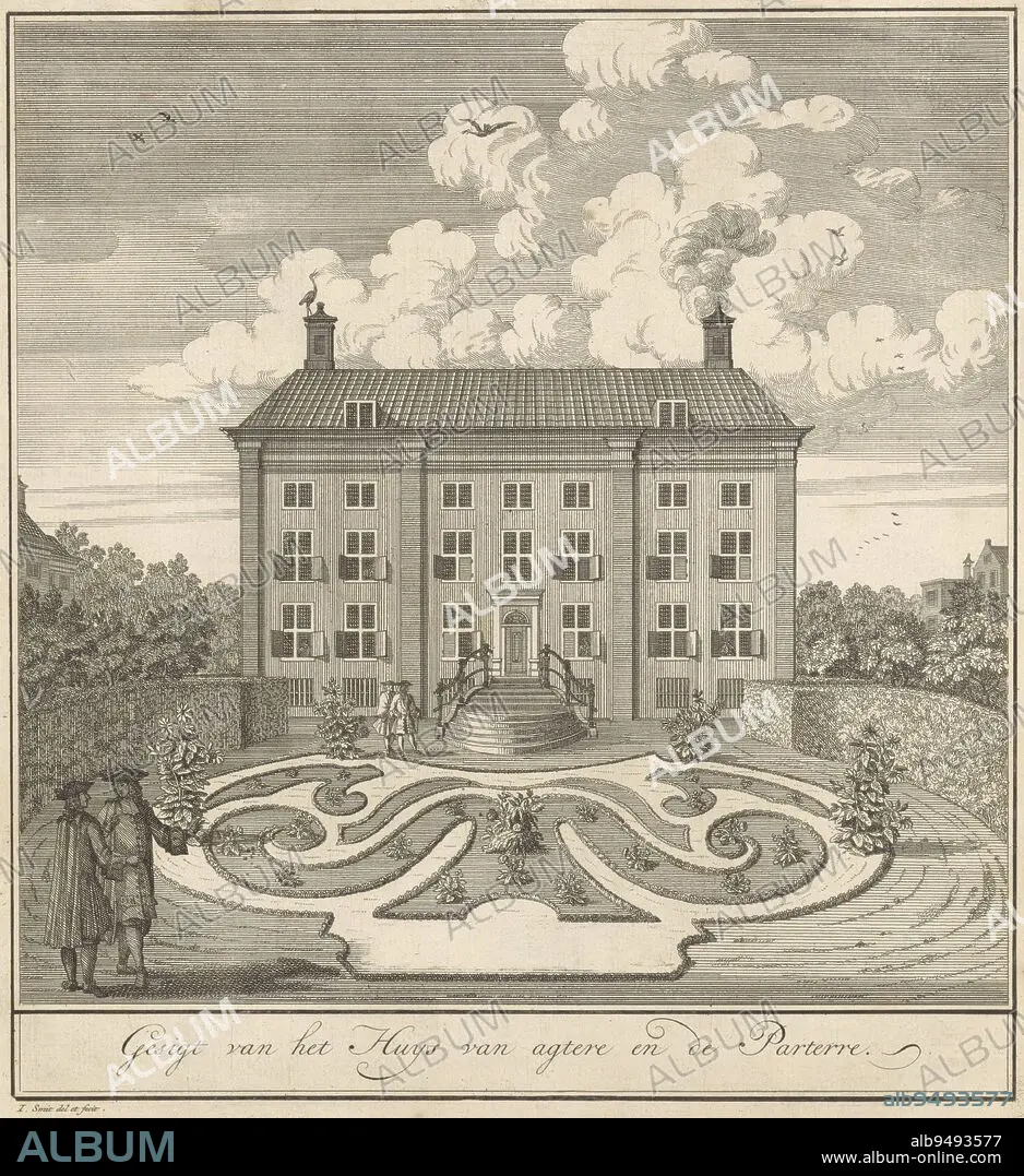 View of the back facade and the parterre de broderie of the Corvershof on Nieuwe Herengracht, Amsterdam. Four figures are walking in the garden. Sunflowers are growing in the parterres. A stork sits on the left chimney. Part of a series of prints of the Corvershof, which opened in 1723 and was intended for elderly couples of Nederduits Gereformeerde (later Reformed) huize, View of the rear facade and the parterre de broderie of the Corvershof in Amsterdam Gesigt van het huys van agtere en de parterre Het Corvershof te Amsterdam , print maker: Jan Smit (I), (mentioned on object), print maker: Jan Smit (II), (mentioned on object), Jan Smit (I), (mentioned on object), Amsterdam, 1723 - 1748, paper, etching, engraving, h 263 mm × w 246 mm