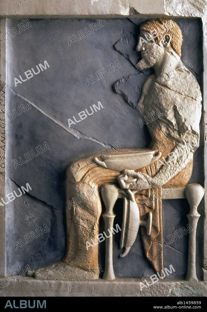 Descripción: ARTE GRIEGO. PERIODO ARCAICO. ESTELA FUNERARIA QUE REPRESENTA A UN ALFARERO. Fechada hacia principios del s. VI a. C, conserva restos de policromía. Museo Arqueológico Nacional. Atenas. Grecia.