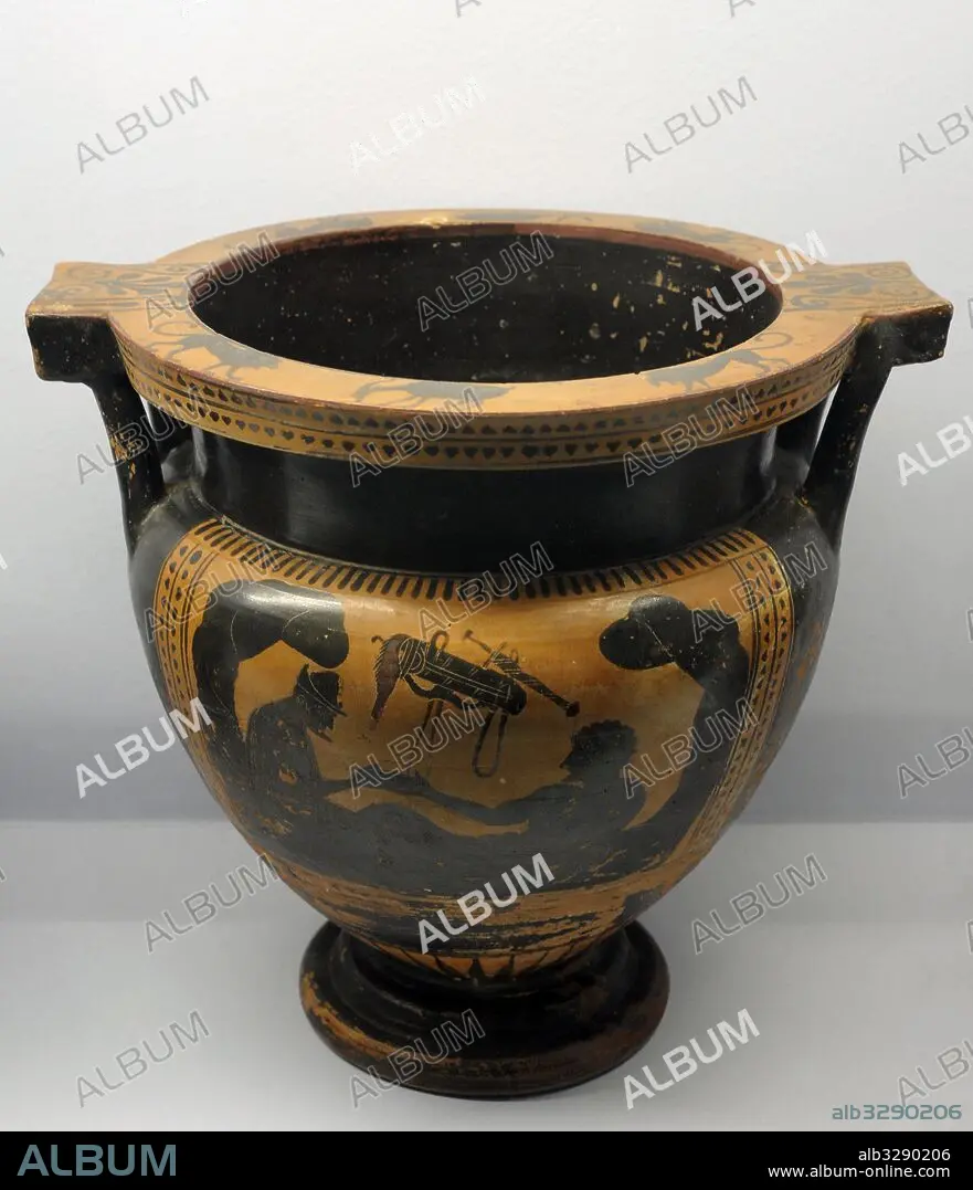Crátera griega con la representación del héroe Hércules y el Dios Hermes en un banquete en una cueva. 510-500 a. C. Realizada en Atenas. Obra del pintor de Rycroft. Cerámica. Figuras negras. Museo Arqueológico Nacional. Nápoles. Italia.