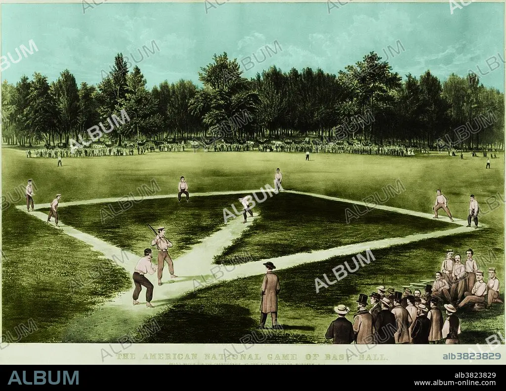 An illustration of the New York Knickerbockers playing at the Elysian Fields in Hoboken, New Jersey, 1846.
