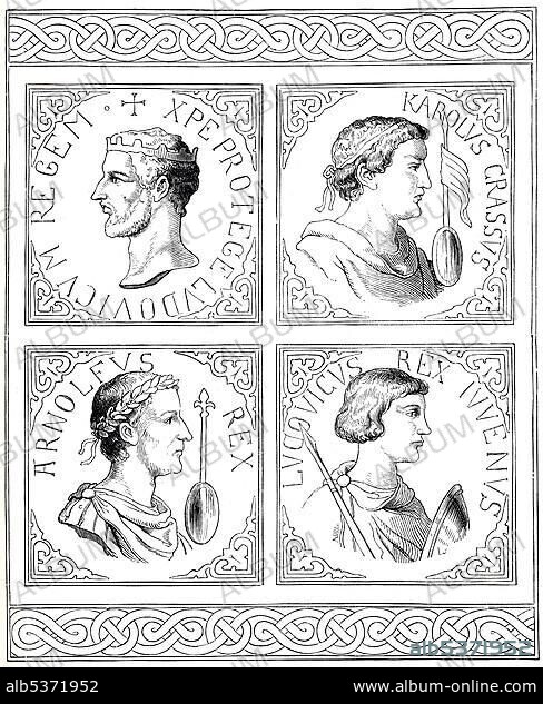 The sons of Louis the Pious, king of the Frankish kingdom, Louis the German, Louis II, Ludovicus II, 806 - 876, Carloman, Louis the Younger and Charles the Fat, historical illustration from Bildnisse der Deutschen Koenige und Kaiser, Portraits of German Kings and Emperors, by Professor Heinrich Schneider, Verlag Friedrich Andreas Perthes, Gotha, 1889