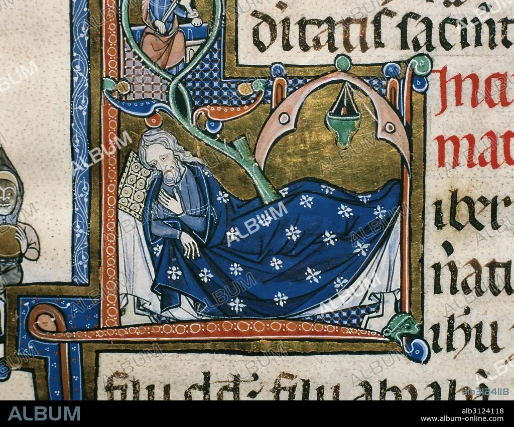 SIGLO XIII. ILUMINACION GOTICA FRANCESA. BIBLIA SACRA. Volumen IV. NUEVO TESTAMENTO. Manuscrito en pergamino. 385 mm x 255 mm (el folio). Miniatura inicial figurada con la representación de un HOMBRE RECOSTADO. El fondo con aplicación de oro en láminas. Sant Sadurní sobre el Roine (Francia) (?). Acabado en febrero de 1268. Procedente de la Seu de Vic. Museu Episcopal de Vic. Provincia de Barcelona. Comarca de Osona. Cataluña.
