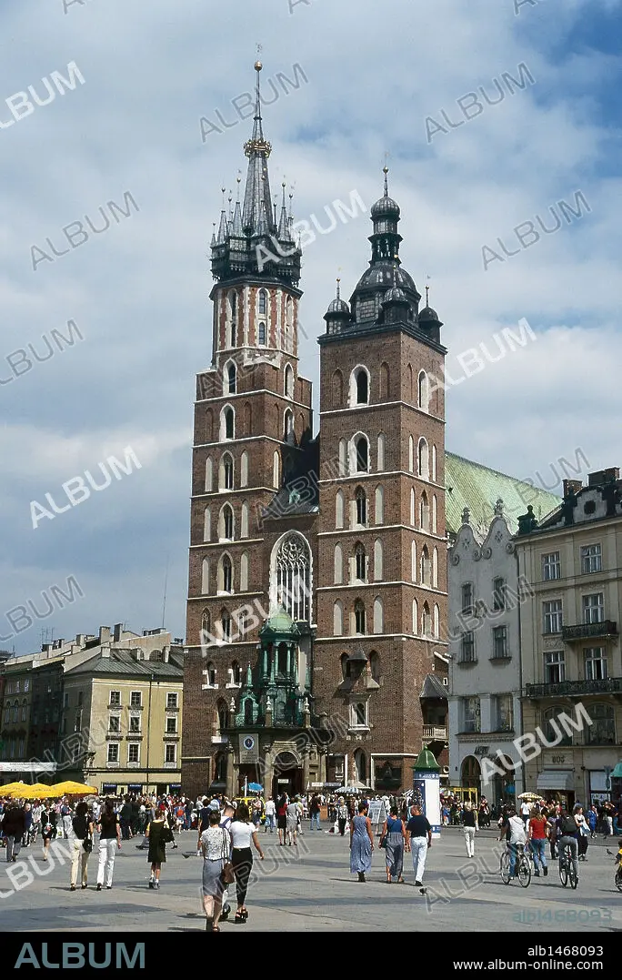 Descripción: POLONIA. CRACOVIA. Vista de la PLAZA DEL MERCADO CENTRAL con la IGLESIA DE SANTA MARIA, fundada en 1222 por el obispo de Cracovia Iwo Odrowaz y destruida por los tártaros en el año 1241. El edificio actual es una basílica construida entre 1345 y 1408 con dos torres del siglo XIV con añadidos posteriores en diferentes estilos.