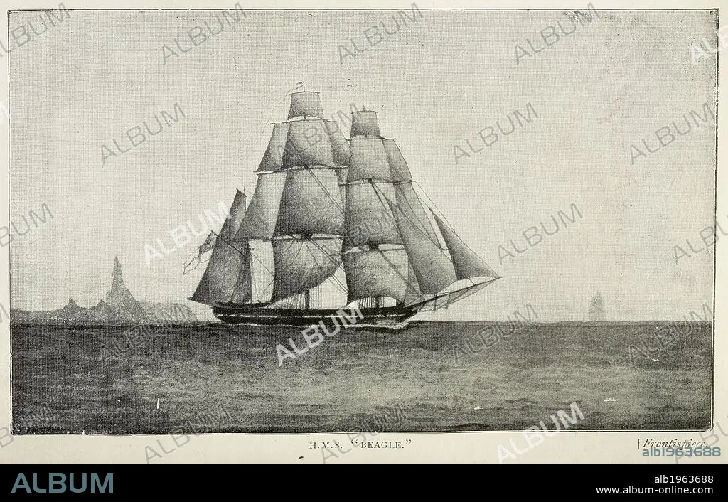 An illustration from the journals of Charles Darwin, on his voyage on HMS Beagle. Frontispiece. Ship in full sail. Journal of researches into the natural history and geology of the countries visited during the voyage round the world of H. M. S. Beagle under command of Captain Fitz Roy RN. Lodon 1912. Journal of researches into the natural history and geology of the countries visited during the voyage round the world of H. M. S. Beagle under command of Captain Fitz Roy RN / Charles Darwin. Darwin, Charles, 1809-1882 . Source: X.4/2711 frontispiece.