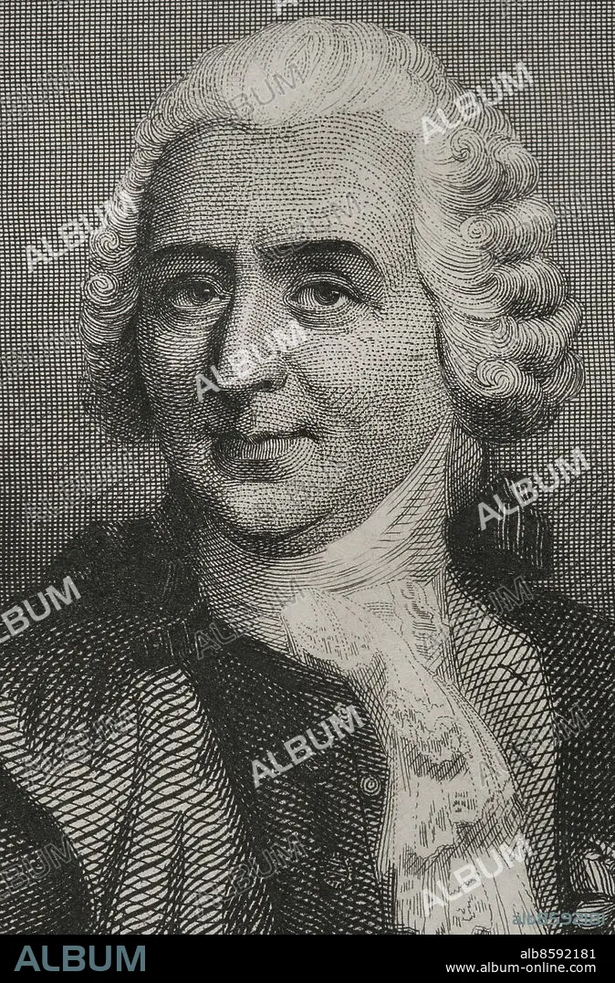 Descripción: Carl von Linneo (1707-1778). Médico y botánico sueco. Estableció la nomenclatura por la que todo ser vivo es designado por sus dos nombres latinos, el del género y el de la especie. Retrato. Grabado por Geoffroy. Detalle. Historia Universal, por César Cantú. Tomo VI. 1857.