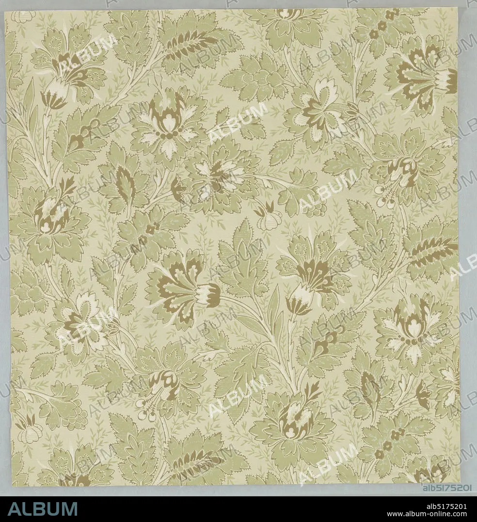 Sidewall, Machine-printed paper, Aesthetic style design of dense all-over foliage with large fanciful bellflowers; single-motif, long vertical repeat in off-set columns; color scheme of light green, brown, and white with brown outlining; pale tan ground., USA, ca. 1880, Wallcoverings, Sidewall.