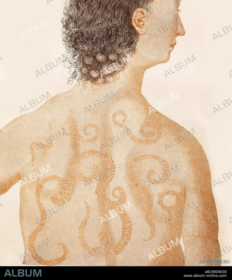 Color plate showing psoriasis gyrata on the back, 1808. Psoriasis gyrata is a rare form of psoriasis in which curved linear patterns predominate.