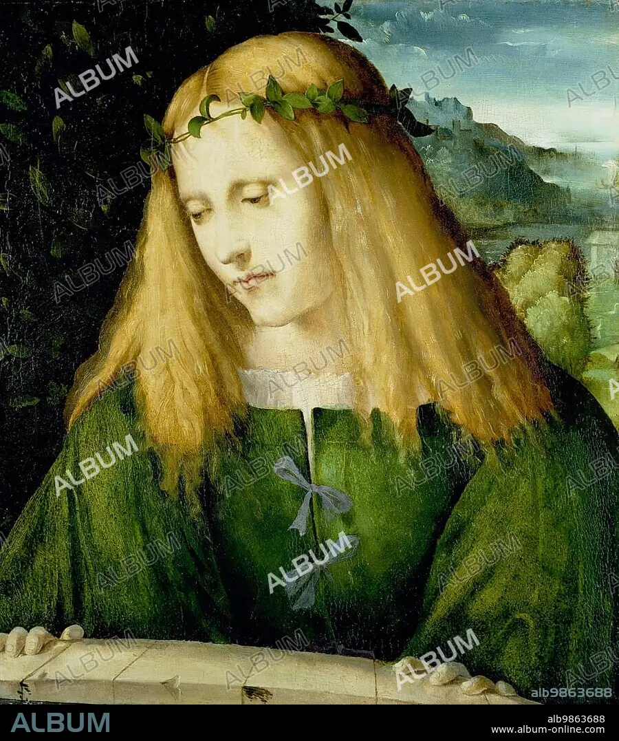 (Narcissus), in Greek mythology is a beautiful youth who rejected the love of others and fell in love with his own reflection, at the edge of the fountain, c. 1550, painting by Altobello Meloni, Historic, digitally restored reproduction from a 19th century original