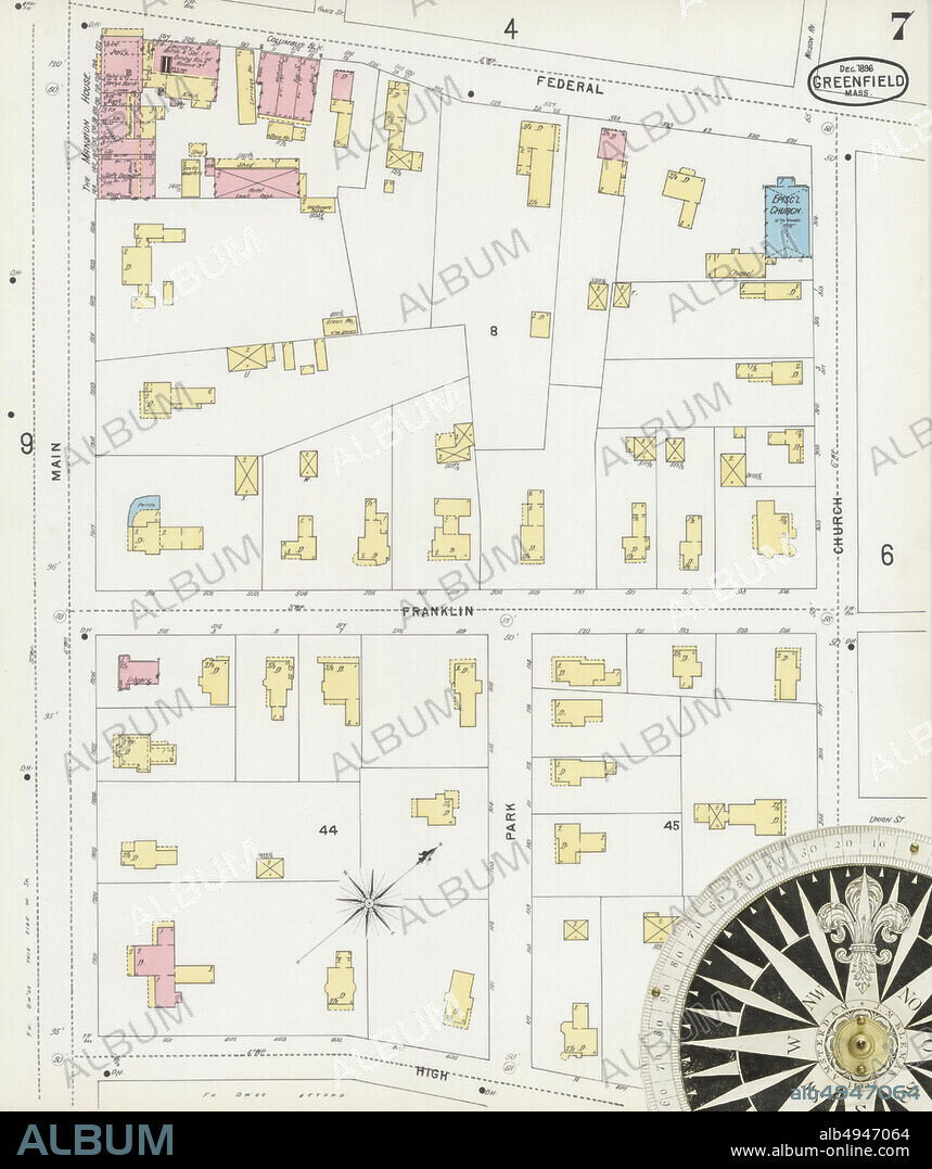 Image 7 of Sanborn Fire Insurance Map from Greenfield, Franklin County, Massachusetts. Dec 1896. 11 Sheet(s), America, street map with a Nineteenth Century compass.
