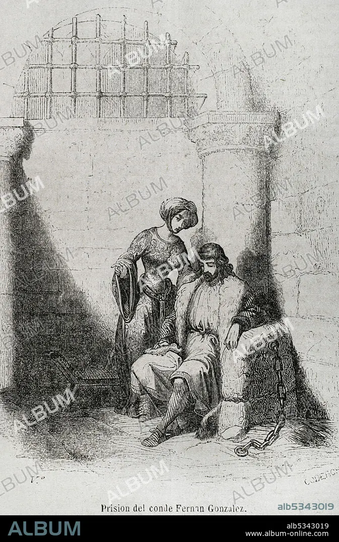 Descripción: Prisión del Conde de Castilla Fernando González o Fernán González (h. 910-970). Grabado por Coderch. Historia General de España por el padre Mariana. Madrid, 1852.