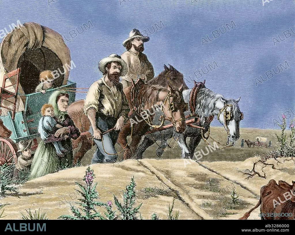 HISTORIA DE LOS ESTADOS UNIDOS. SIGLO XIX. FAMILIA DE COLONOS DESPLAZANDOSE DE ARKANSAS A TEXAS EN EL AÑO 1870. El transporte en carretas era la manera más usual de viajar, incluso después de completar la línea férrea transcontinental. Grabado del "Harper's Weekly", año 1874. Coloreado.